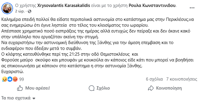 Ένας άνδρας με καλυμμένα τα χαρακτηριστικά του προσώπου του, εισέβαλλε το βράδυ στις 21:25, της Δευτέρας 12 Ιανουαρίου 2026 σε κατάστημα καφέ (Take Away) επί της οδού Περικλέους στην Ξάνθη, αποσπώντας τις εισπράξεις της ημέρας, χωρίς ωστόσο να πειράξει την υπάλληλο που εργάζονταν εκείνη την στιγμή.