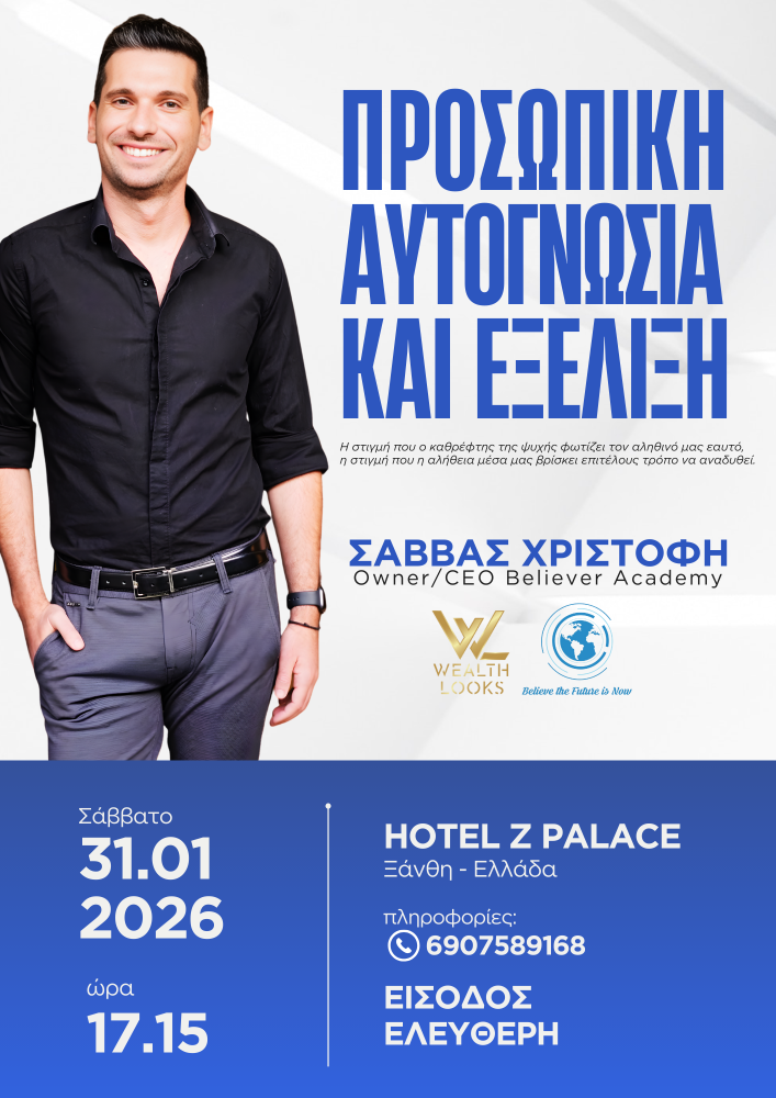 Το Σάββατο 31 Ιανουαρίου, στις 17:15, στο Ξενοδοχείο Z PALACE στην Ξάνθη θα δώσει διάλεξη ο διεθνώς καταξιωμένος entrepreneur, international trainer, investor Σάββας Χριστοφή.
