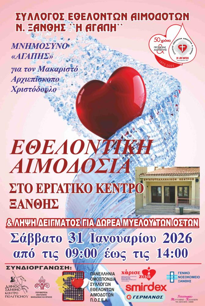 Σας καλούμε λοιπόν στην τέταρτη οργανωμένη τακτική εθελοντική αιμοδοσία του έτους 2026, το Σάββατο 31 Ιανουαρίου 2026 από τις 09:00 πμ έως και τις 14:00 μμ στην κεντρική αίθουσα εκδηλώσεων του Εργατικού Κέντρου Ξάνθης.