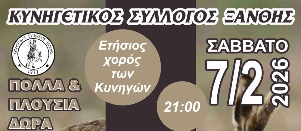 Το Διοικητικό Συμβούλιο του Κυνηγετικού Συλλόγου Ξάνθης προσκαλεί τους φίλους κυνηγούς με τις οικογένειες τους, στον ετήσιο χορό του Συλλόγου μας που θα πραγματοποιηθεί το Σαββάτο 7 Φεβρουαρίου 2026, στις 21:00,