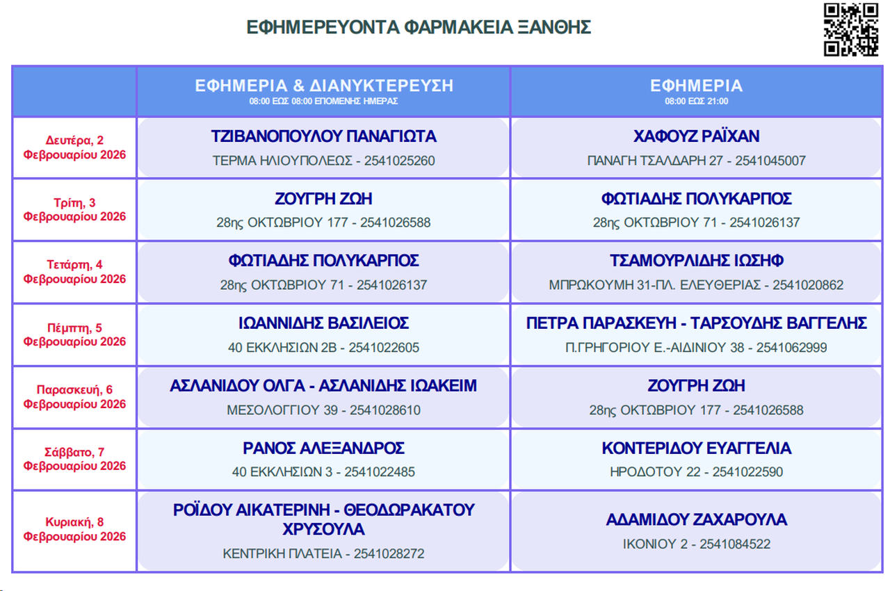 » Τα Εφημερεύοντα Φαρμακεία Ξάνθης, από τη Δευτέρα 2 έως την Κυριακή 8 Φεβρουαρίου 2026