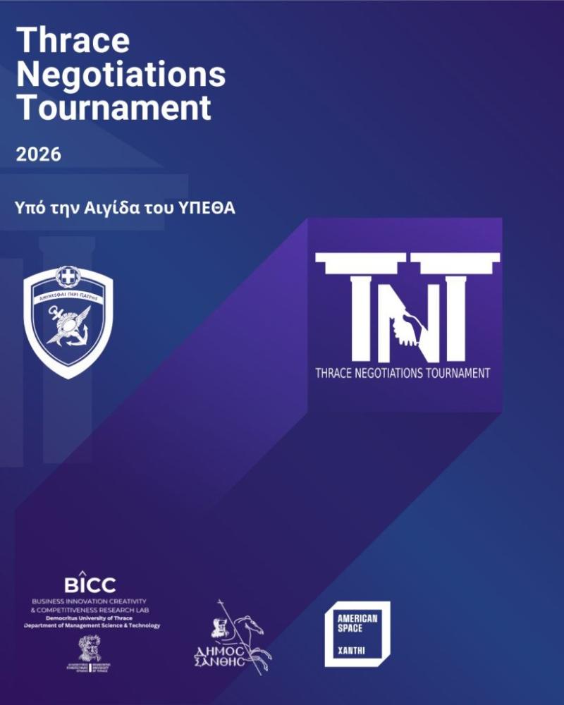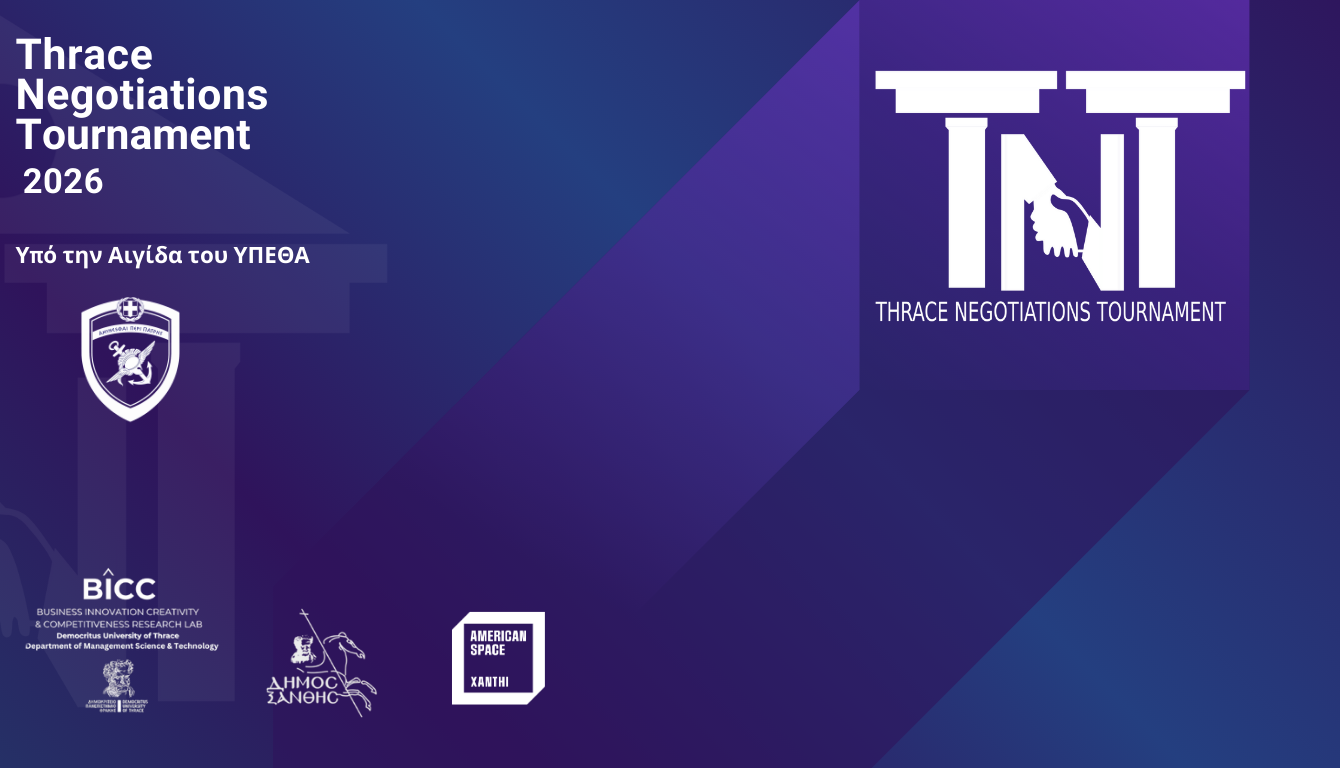 Ο μεγαλύτερος διαγωνισμός διαπραγμάτευσης στη Βόρεια Ελλάδα επιστρέφει και φέτος με δυναμισμό και καινοτομία! Το Thrace Negotiations Tournament (TNT) 2026 ανοίγει ξανά τις πόρτες του, προσκαλώντας φοιτητές, νέους επαγγελματίες και κάθε ενδιαφερόμενο να ζήσει μια μοναδική εμπειρία στρατηγικής σκέψης και διαχείρισης διαπραγματεύσεων στη Θράκη.
