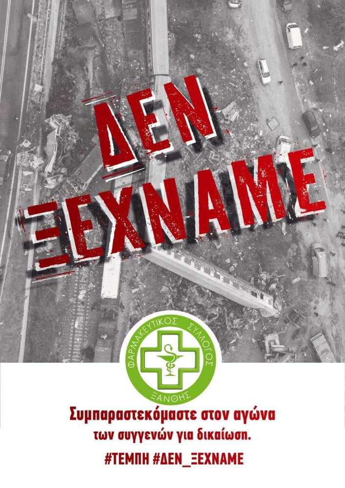 Ως ελάχιστη ένδειξη σεβασμού και τιμής απέναντι στα 57 αδικοχαμένα θύματα και τις οικογένειές τους, οι φαρμακοποιοί της Ξάνθης ενώνουμε για ακόμα μία φορά τη φωνή μας με όλους τους συμπολίτες μας και καλούμε τους συναδέλφους να συμμετάσχουν στη συγκέντρωση που θα πραγματοποιηθεί στην Ξάνθη το Σάββατο 28 Φεβρουαρίου στην κεντρική πλατεία της πόλης στις 12 το πρωί.