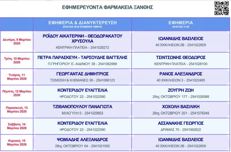 Δείτε τα εφημερεύοντα φαρμακεία από 9 Μαρτίου έως 15 Μαρτίου στην Ξάνθη.