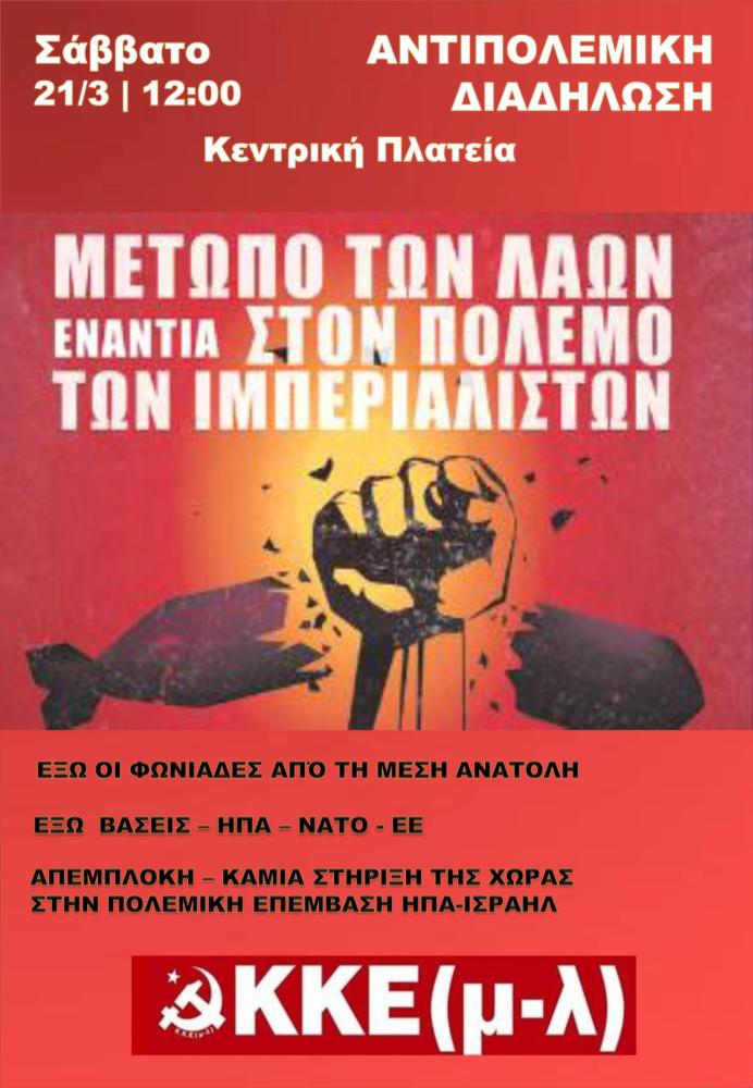 Θέλοντας να απαντήσει σε όλα αυτά, αλλά και να συμβάλει στην ανάγκη συγκρότησης αντιπολεμικού-αντιιμπεριαλιστικού κινήματος στη χώρα, το ΚΚΕ(μ-λ) διοργανώνει στην Ξάνθη ανοιχτή συζήτηση τη Δευτέρα 23 Μαρτίου στις 18:30, στο καφέ Φίλοιστρον.