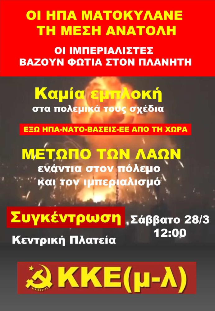 Καλούμε σε αντιπολεμική αντιιμπεριαλιστική συγκέντρωση το Σάββατο 28 Μάρτη, 12:00 το μεσημέρι στην Κεντρική Πλατεία.