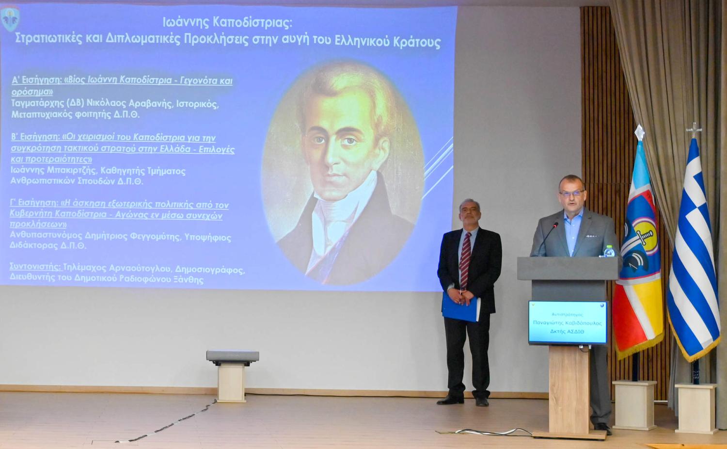 β. Ομιλία από τον Ταγματάρχη (ΔΒ) κ. Νικόλαο Αραβανή, μεταπτυχιακό φοιτητή του Δημοκρίτειου Πανεπιστημίου Θράκης, με θέμα «Βίος Ιωάννη Καποδίστρια - Γεγονότα και ορόσημα»