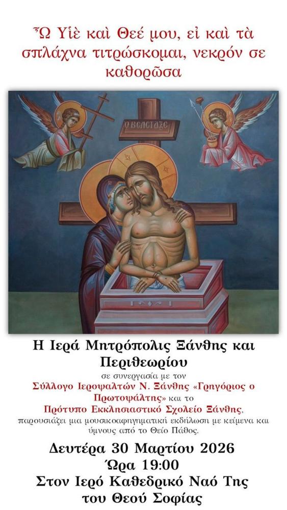 Ἡ Ἱερὰ Μητρόπολις Ξάνθης καὶ Περιθεωρίου, ἐν συνεργασίᾳ μετὰ τοῦ Συλλόγου Ἱεροψαλτῶν Ν. Ξάνθης «Γρηγόριος ὁ Πρωτοψάλτης» καὶ τοῦ Προτύπου Ἐκκλησιαστικοῦ Σχολείου Ξάνθης, ἀναγγέλλει εἰς τὸ εὐσεβὲς πλήρωμα τῆς τοπικῆς Ἐκκλησίας ὅτι τὴν Δευτέραν 30ὴν Μαρτίου 2026, καί ὤρα 19:00 ἐν τῷ Ἱερῷ Καθεδρικῷ Ναῷ τῆς τοῦ Θεοῦ Σοφίας Ξάνθης, θὰ πραγματοποιηθῇ μουσικοαφηγηματικὴ ἐκδήλωσις μὲ τίτλον: