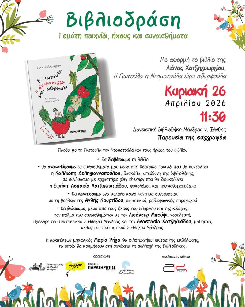 «Η Γιωτούλα η Ντοματούλα έχει αδερφούλα», που θα πραγματοποιηθεί, παρουσία της συγγραφέα, την Κυριακή 26 Απριλίου 2026, στις 11:30, στη Δανειστική Βιβλιοθήκη