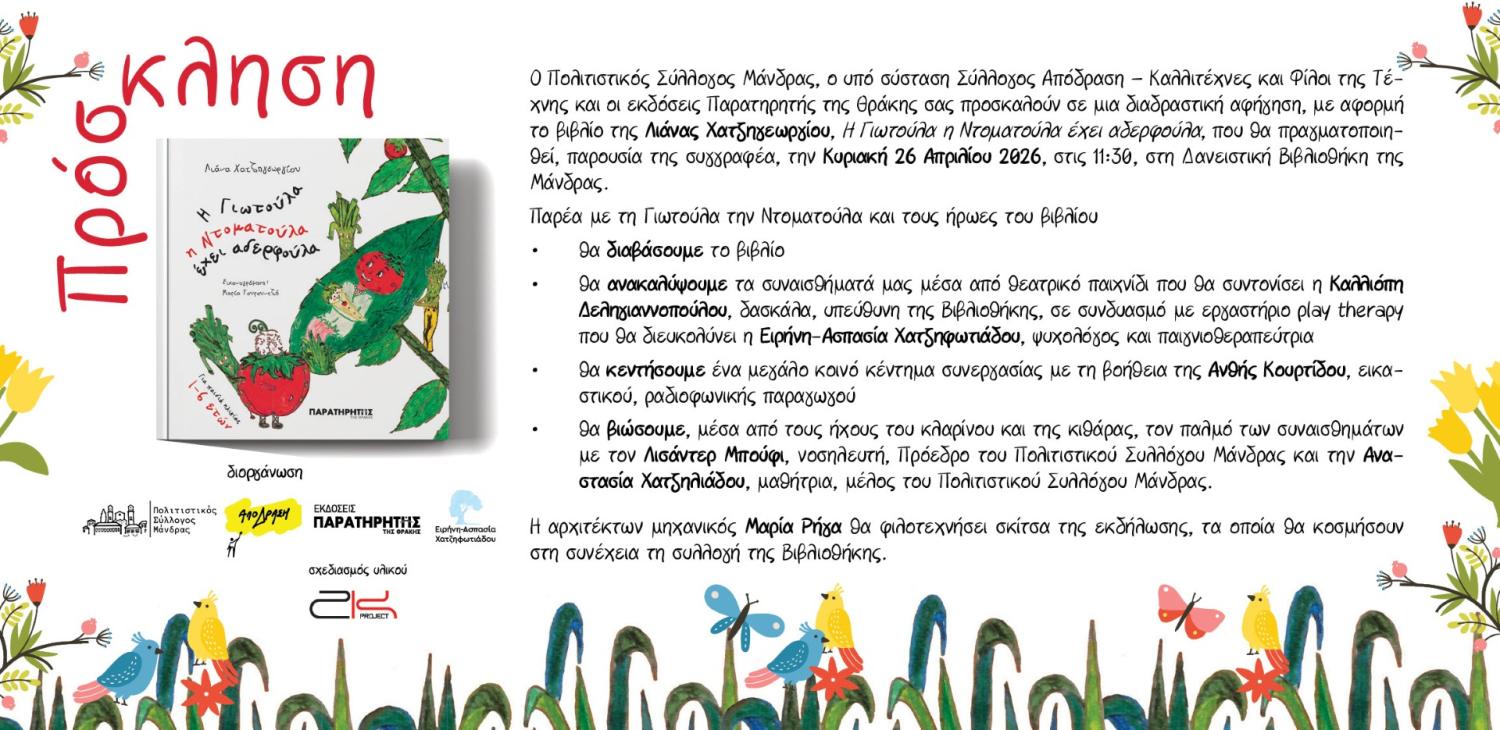 Ο Πολιτιστικός Σύλλογος Μάνδρας, ο υπό σύσταση Σύλλογος Απόδραση – Καλλιτέχνες και Φίλοι της Τέχνης και οι εκδόσεις Παρατηρητής της Θράκης σας προσκαλούν σε μια διαδραστική αφήγηση, με αφορμή το βιβλίο της Λιάνας Χατζηγεωργίου,