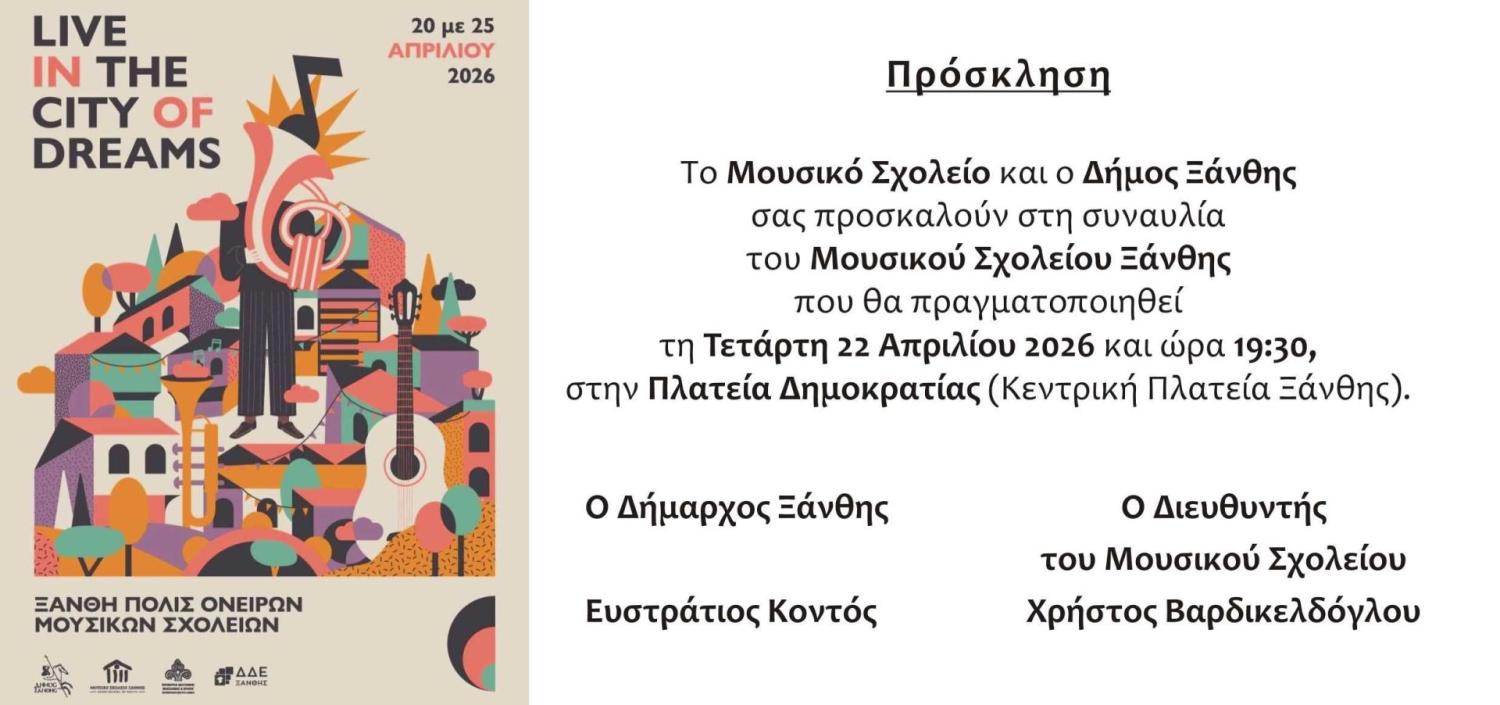 Το Μουσικό Σχολείο Ξάνθης και ο Δήμος Ξάνθης σας προσκαλεί όλους και όλες στην τελετή έναρξης του Φεστιβάλ Ξάνθη Πόλις Ονείρων 2026, την Τετάρτη 22 Απριλίου και ώρα 19:30 στην Κεντρική Πλατεία της πόλης μας, όπου θα παρακολουθήσετε τη συναυλία κινηματογραφικής μουσικής της Συμφωνικής Ορχήστρας του Μουσικού Σχολείου Ξάνθης υπό την διεύθυνση του Άρη Τρακάκη.